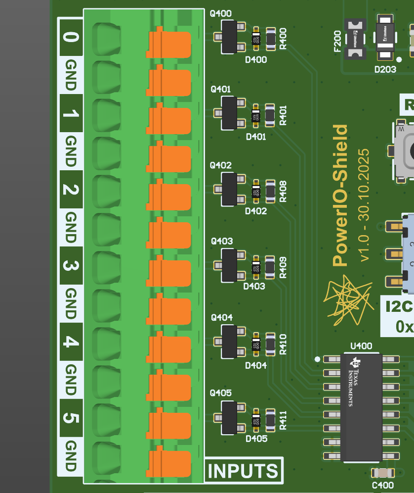 The Power IO shield offers 6 high-voltage-capable digital inputs, which can be accessed via a spring terminal block.