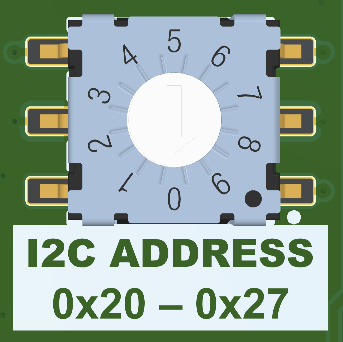 The shield’s \(I^2C\) address is the sum of 0x20 and the number selected via the rotary switch.